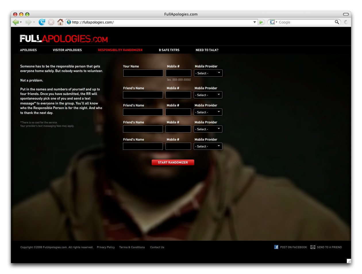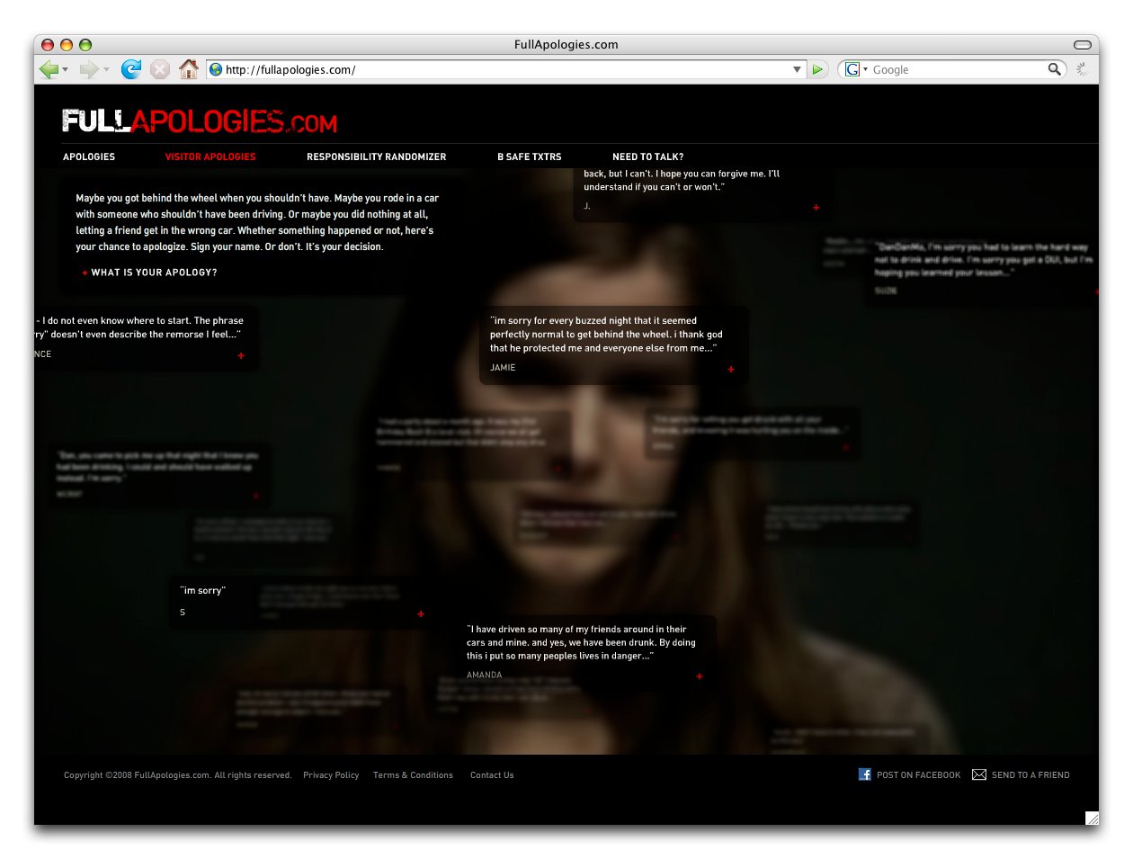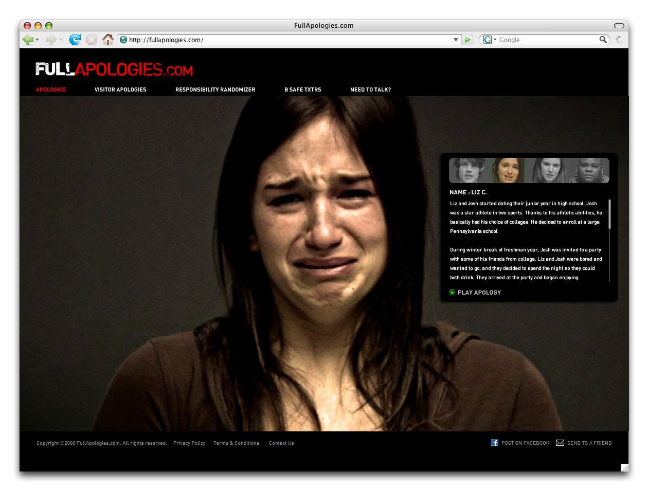 Winning a One Show Gold Pencil, FullApologies.com featured full-bleed video of a teen apologizing directly to a friend or a parent of someone they hurt by drinking and driving. A brief story appeared to the side providing context about what happened that night, and afterwards.