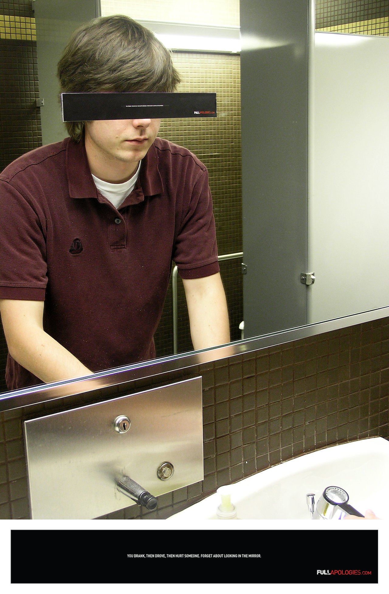 We placed mirror clings in high school bathrooms at eye level. Bending in to read the small type, the reader’s eyes become hidden by the black bar.